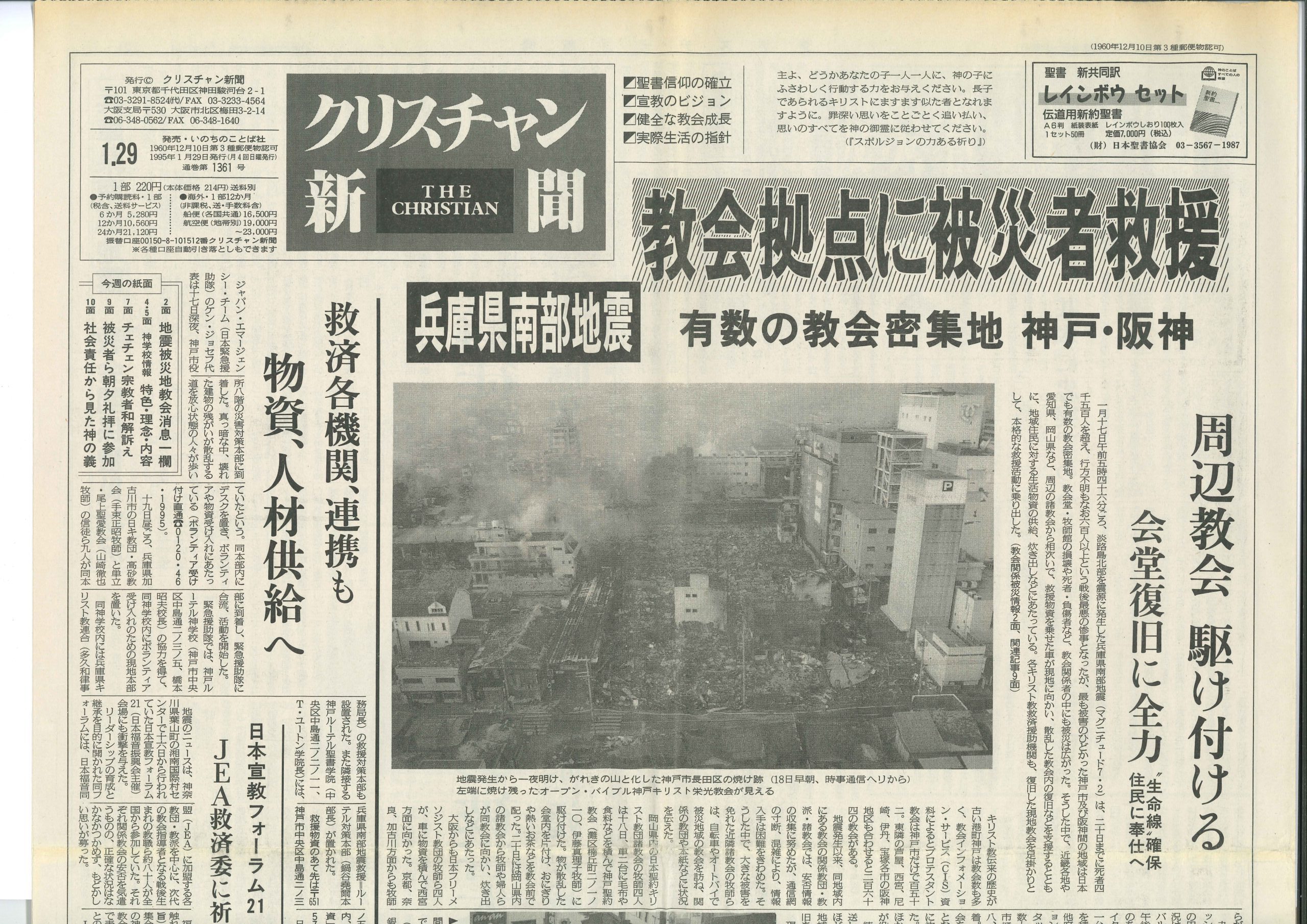 信徒から一人も犠牲者がなかったのは奇跡だった。同教会牧師の小林登代子さんは教会近くのマンションで被災した。ベッドはトランポリンのように跳ねた。飛ばされないように懸命にしがみついていた。近所の大きな商店街は倒壊して、出火した。数日後、避難場所の学校から焼けこげたマンションに入った。「神学書も写真もすべてきれいな白い灰になっていました」と、振り返る。