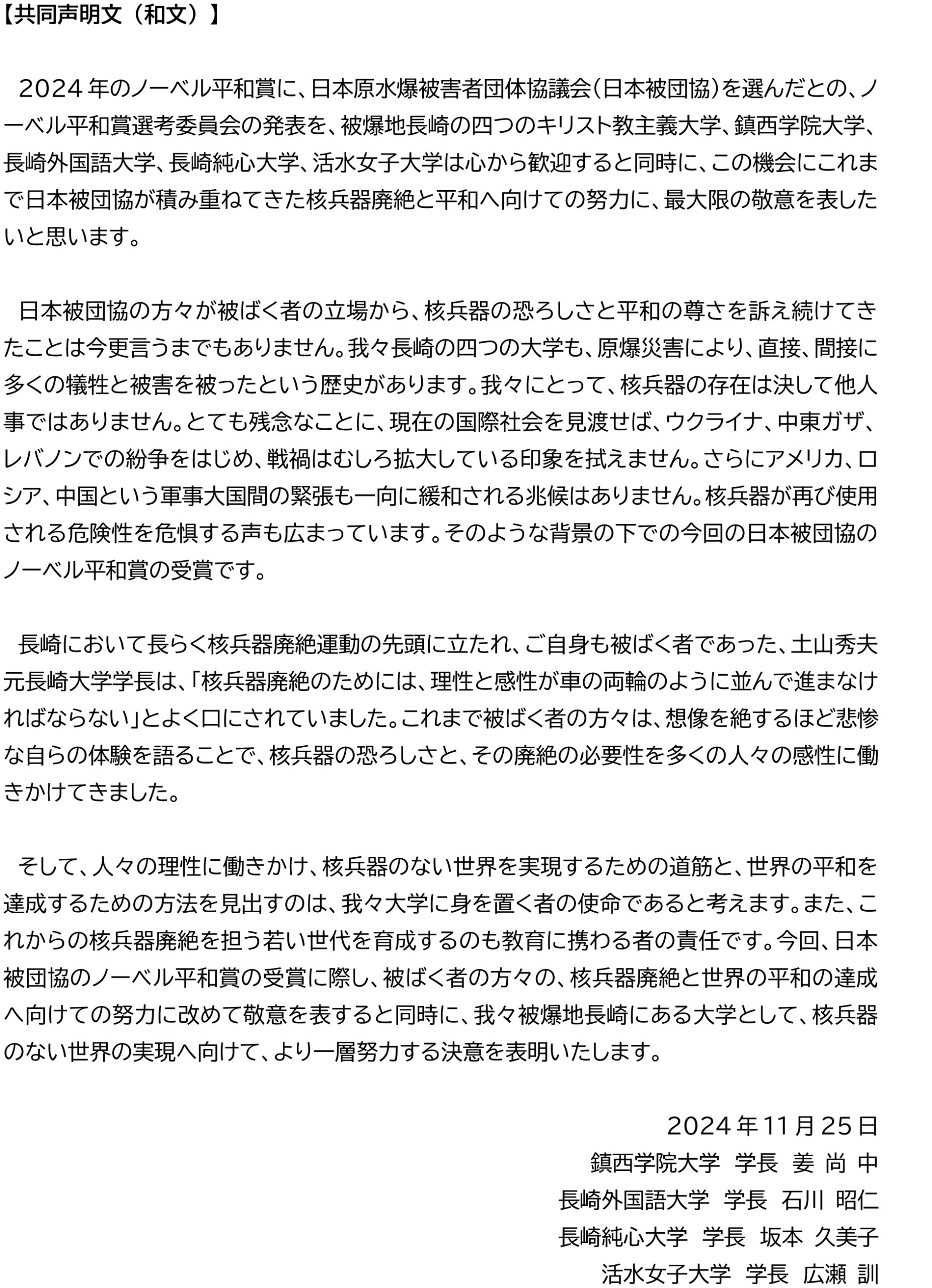 日本原水爆被爆者団体協議会(日本被団協)のノーベル平和賞受賞を受け、活水女子大学、長崎外語大学、長崎純心大学、鎮西学院大学は11月25日、連名で「日本原水爆被爆者団体協議会の2024年ノーベル平和賞受賞に寄せての四大学共同声明」を発表した。