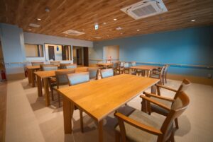 木の温もりを感じる老舗メーカーの木工家具を配置した食堂