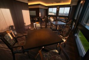 カフェテラスの中。落ち着いたテーブルセットがゆったりと並ぶ