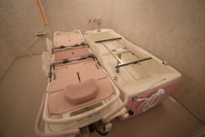 1階はショートステイとデイサービス。2階は24時間看護が必要な、医療依存度の高い人のためのフロアだ。3、4階は理学療法士による機能訓練や運動プログラムなど、充実したリハビリで入居者の健康を支える。フロアごとに各階の入居者の状態に合わせた介護用入浴機を3台設置しているのも特徴。寝たままでも、座ったままでもお風呂を楽しめる。