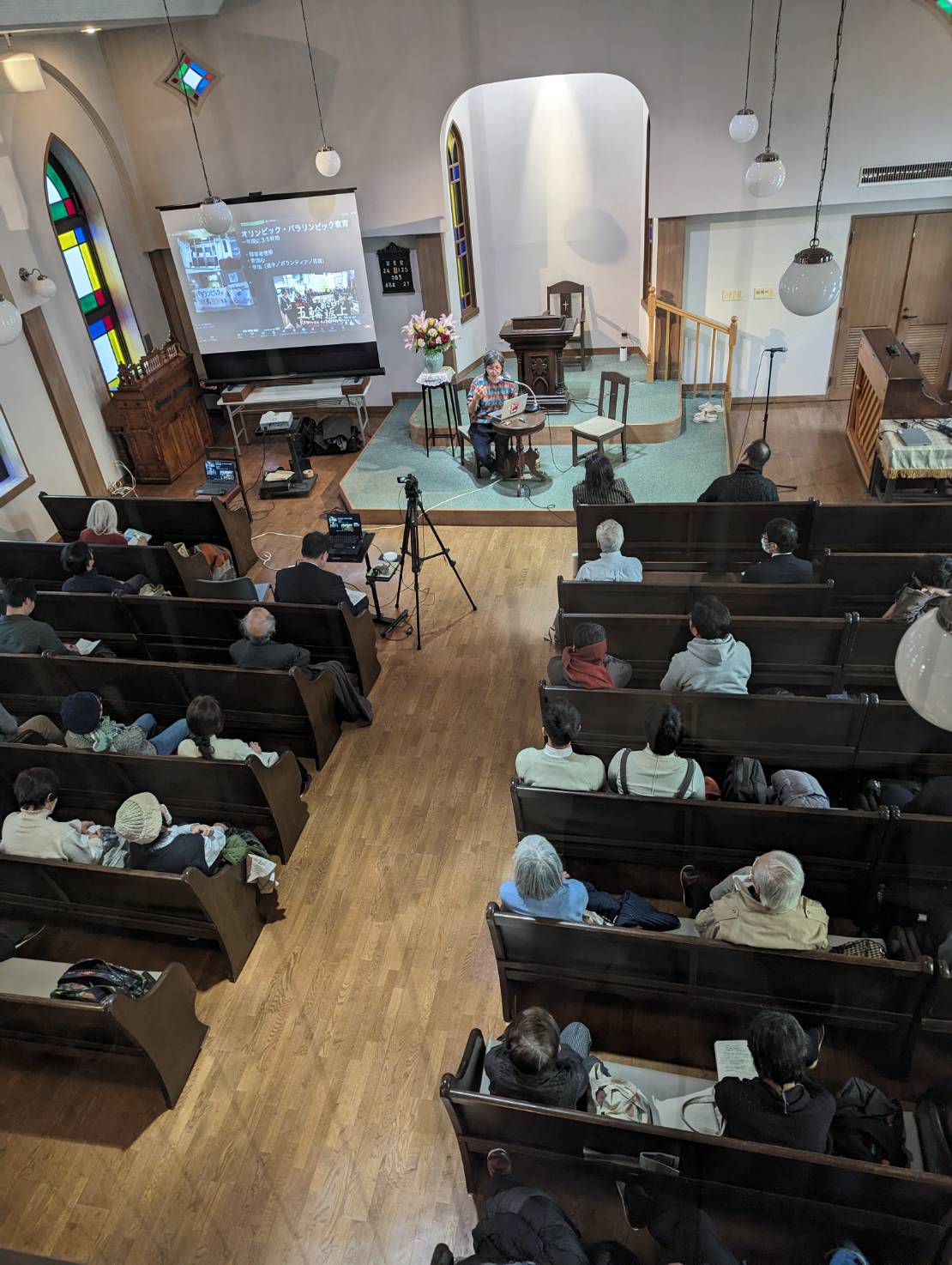 1月28日、日本基督教団室町教会(京都市上京区)において、連続講演会「大阪・関西万博を考える-メガイベントはもういらない-」の第1回が開催されました(日本基督教団京都教区「教会と社会」特設委員会・兵庫教区社会部・大阪教区社会委員会の共催)。講師は東京から、いちむらみさこさん(反五輪の会メンバー)をお招きし、「排除」[感動ビジネスと生活破壊―OLYMPICS KILL THE POOR]の主題で、お話をうかがいました。