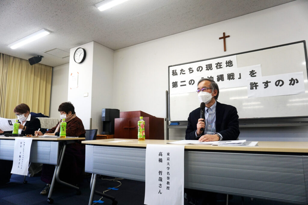 前半は基地引き取り論の提唱者、高橋哲哉さん(哲学者)が講演した。「各種世論調査では、戦争脅威、集団的自衛権、防衛費増額などへの賛成が多数派になっている」「防衛省の専門家がメディアに露出するなど、様々なキャンペーンで反戦、厭(えん)戦の空気を払しょくしている」「中国が2027年までに台湾侵攻する、という米高官の情報から、日本も戦争準備を加速している」など、現状を分析した。