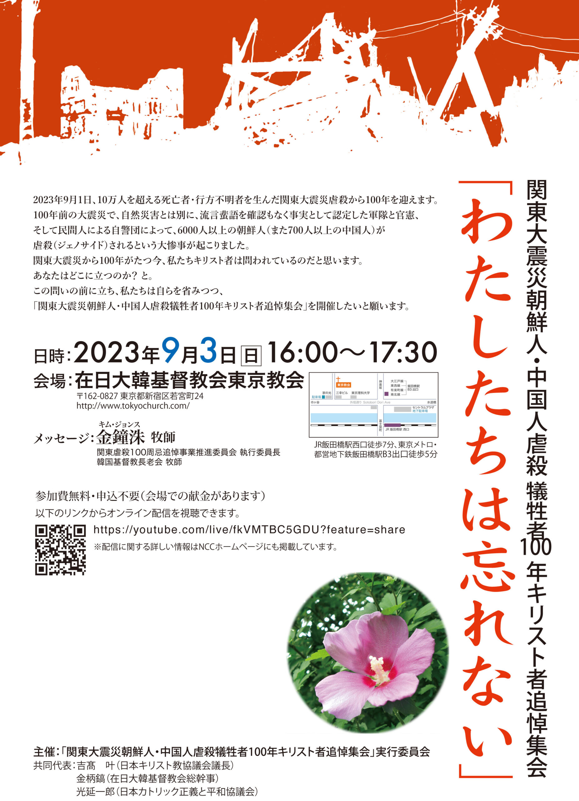 キリスト教会においても、「関東大震災朝鮮人・中国人虐殺犠牲者100年キリスト者追悼集会」が9月3日午後4時から、東京・新宿区の在日大韓基督教会東京教会で開かれる(インターネット配信あり。ncc-j.org)。