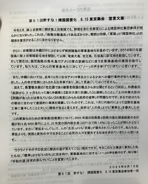 アジア太平洋戦争での日本の敗戦を記念する、8月15日、キリスト者などからなる8.15集会が、東京・新宿区の日基教団・四谷新生教会で開かれた。