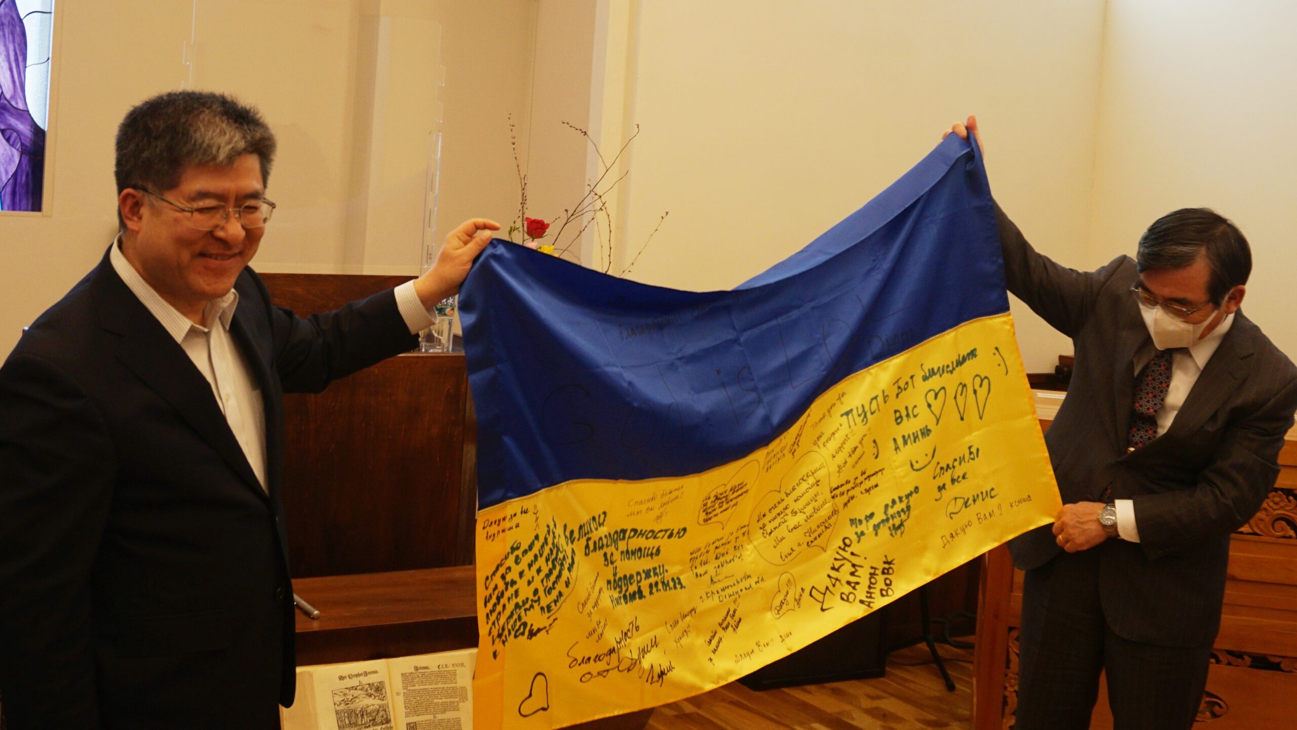 会場教会にメッセージ付きの国旗が送られた