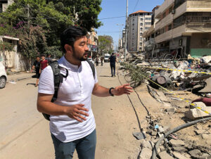 「半分、意地で中東(取材)をやっている」という須賀川記者は、パレスチナ自治区のガザへ出発する。イスラエル国民を守る名目で分離壁に囲まれ狭い地域を拠点にするイスラム原理主義組織ハマスとイスラエルの戦闘が唐突に起こる。抗戦するイスラエルのミサイルがアパートに着弾し住民10人が亡くなった。男の子4人と妻を亡くしたアルハディディさんは慟哭し、瓦礫の中から生後5か月のオマルちゃんだけ助け出せたとその時の様子を須賀川記者らに話す。須賀川記者は、パレスチナの市民もイスラエルの住民も「被害を受けた人は自分たちのことを知ってもらいたい思いがあるので、率直に話してくれる」という。