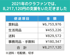 2021年にも、一度クラウドファンディングで目標額の800万円を超えた約900万円の資金をサポートしていただきました。その使途の内訳は以下の通りです。いただいた資金、クラウドファンド運営会社への手数料9%を除いた全額8,217,120円を、生活困窮者のためにだけに使用いたしました。