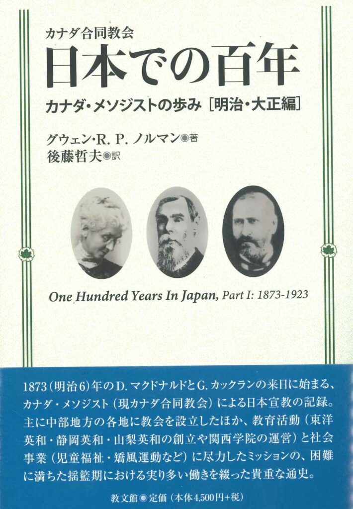 カナダを舞台にした『赤毛のアン』の訳者、村岡花子は、カナダ・メソジスト(現カナダ合同教会)の宣教師に囲まれて育った。『カナダ合同教会 日本での百年』(グウェン・R・P・ノルマン著、後藤哲夫訳、教文館、4千950円税込、A5判)は教会形成とともに、東洋英和、静岡英和、山梨英和、関西学院、青山学院などの教育に携わった宣教師らの姿を伝える。著者は戦前から日本に従事した宣教師夫妻。書簡を豊富に引用し、日本語学習、墓などの文化ギャップ、資金難、人材不足など、様々な苦労が明らかになる。