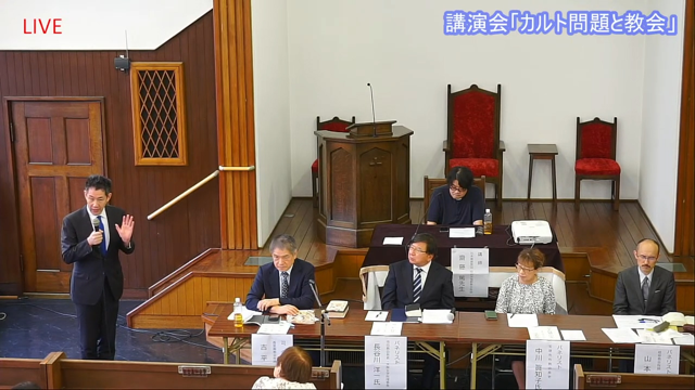 講演会後半はパネル形式で、3名のパネリストが職場や教会の現場から考えを述べた。長谷川洋一長老(池田教会)は大阪女学院理事長として、若い学生が学ぶ教育の現場で、「知る力と見抜く力」を身に着けることの大切さを強調した。中川眞知子長老(宝塚売布教会)は、齋藤牧師の共著『わたしが「カルト」に?』(日本キリスト教団出版局)を読む前と後で、カルトへの考え方が変えられたと述べた。カルトと関わりがあるからと聞いて、警戒したり避けたりするのではなく、救いを求める一人の来会者として接していきたいと語った。山本盾牧師(岐阜教会)は、教師も「ゆがんだ支配構造」に陥る危うさを持つだけに、交わりを深め、教え合い、励まし合うことの必要性を語った。