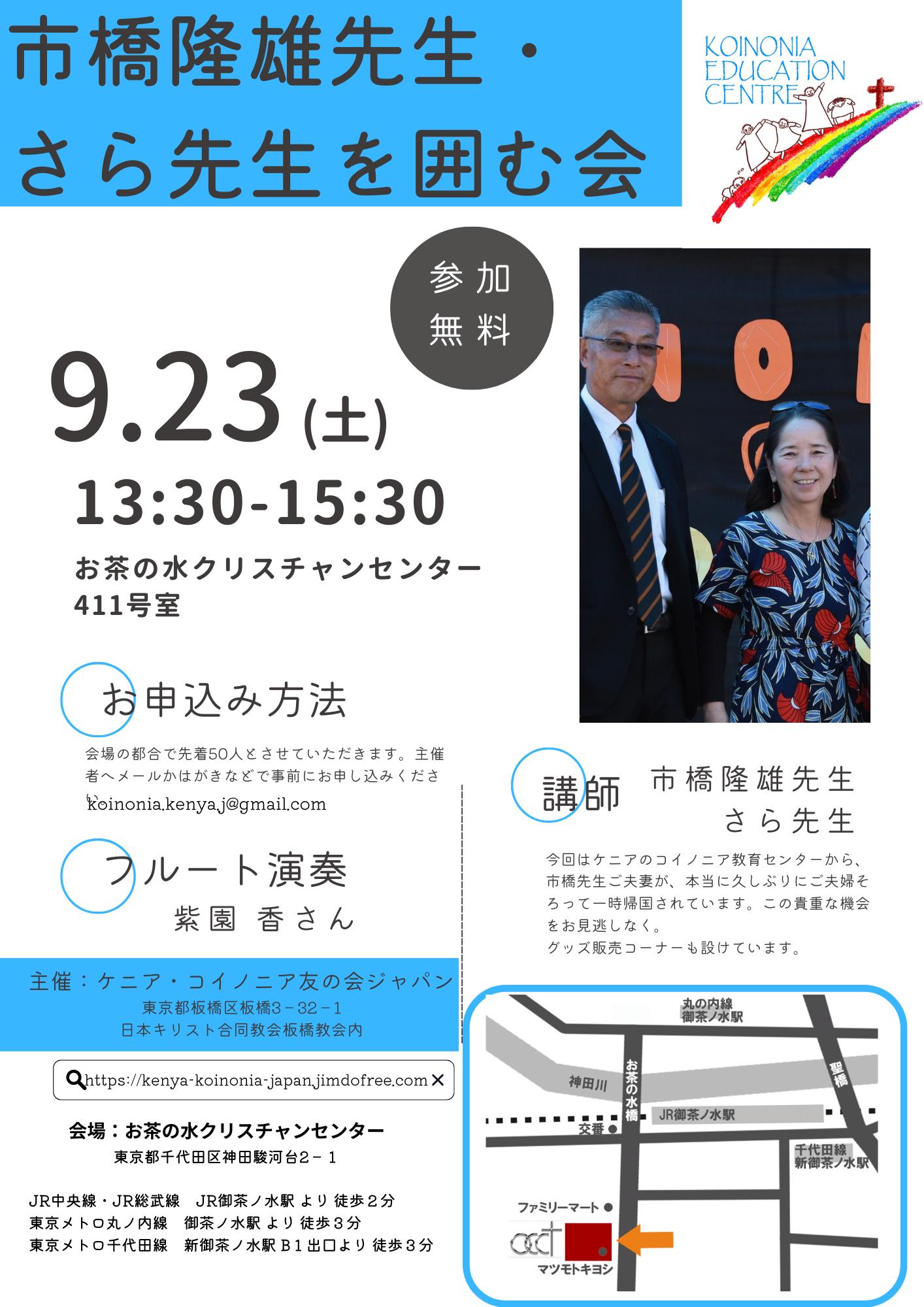 9月23日には「市橋隆雄先生・さら先生を囲む会」をお茶の水クリスチャンセンターで開催します。詳しくはホームページをご覧ください。