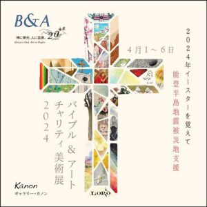2024年イースターを覚え、4月1日から「能登半島地震被災地支援B&A チャリティー美術展 WITH-共に生きる-」が、東京駅八重洲北口徒歩5分のギャラリーカノンで始まった。主催は、バイブル・アンド・アートミニストリーズ(B&A)。