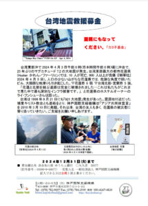 921台湾大地震の時、震源地付近にあった埔里キリスト教会と連絡を取り、以来、台湾との親交がある神戸国際支縁機構(岩村義雄代表)は、「花蓮県の被災地に寄り添っていきたい」と、「台湾地震救援募金」を開設。募金振込先は、ゆうちょ銀行〇九九店58077(記号番号0090-8-58077) 受取人名:一般社団法人神戸国際支縁機構(記入欄に「台湾」と記名)。募金期間は2024年12月31日まで。問い合わせは、Tel078-782-9697、神戸国際支縁機構まで。URL https://kayokofund.jp/