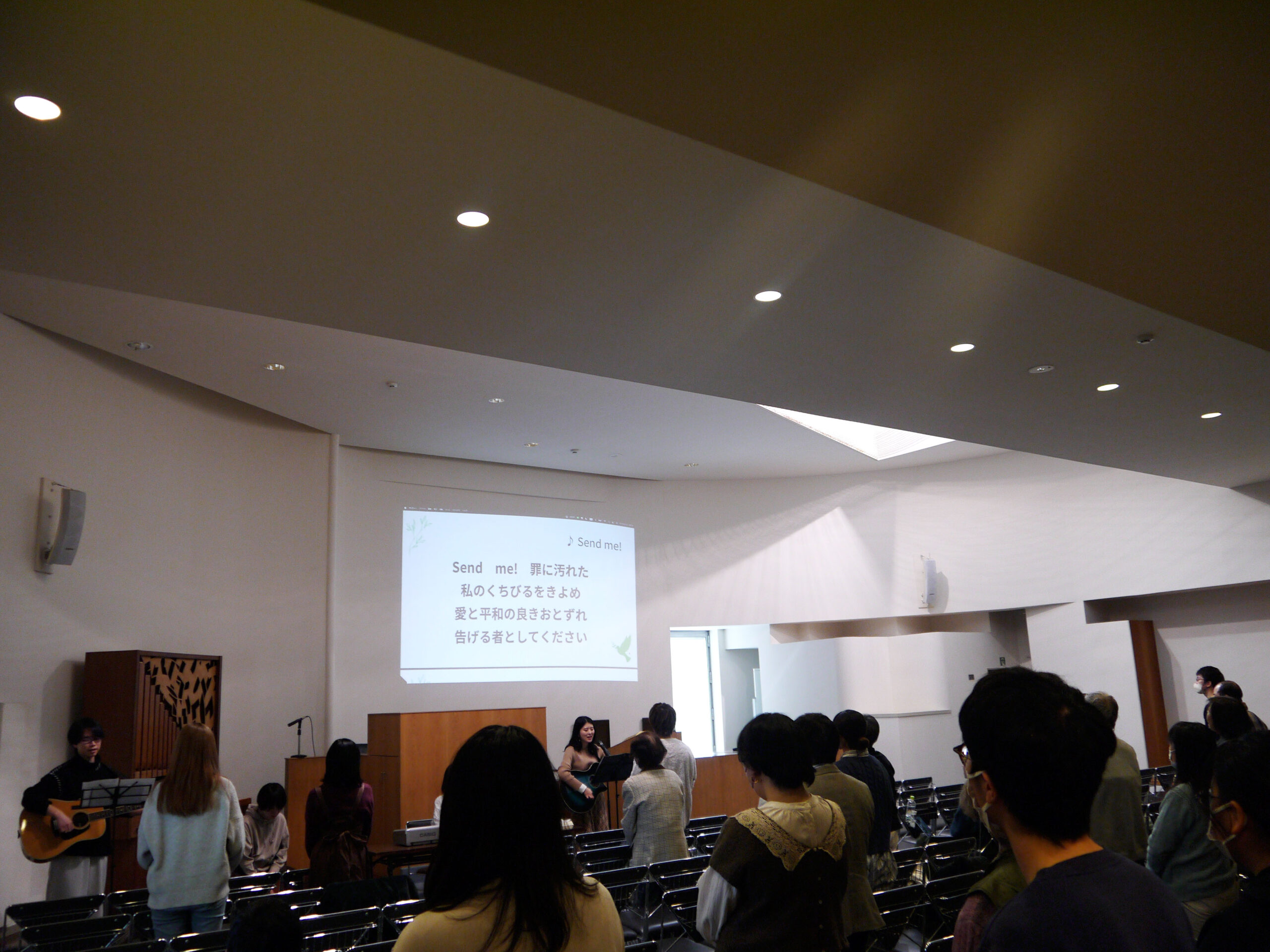 学生会が礼拝をリード。昨年8月に実施された「平和」をテーマにした東部・東関東地区学生会の夏期修養会の報告・証しもあった。グループディスカッションやQ&Aタイムでは現地の状況や情勢、聖書解釈などについて活発な議論があった。
