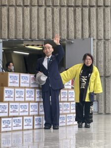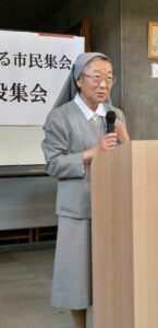 当日は雨と強風の中、元気な石川さんの姿に支援者の沢山の声援がとびかった。また、集会に先立って、キリスト者前段集会が神谷町にある聖アンデレ教会(聖公会)で行なわれ、各教派代表の挨拶、「同和問題」にとりくむ宗教教団連帯会議代表の僧侶の連帯の呼びかけがあった。最後に、シスター細渕則子さん(マリアの宣教者フランシスコ修道会)が「私と狭山事件」と題して短い講演を行なった。ミカ書を読みながら、石川一雄さんと出会い、いろいろな気づきが与えられていることを、静かに確信をもって語った。(レポート・鳥井新平=日本基督教団近江平安教会牧師)