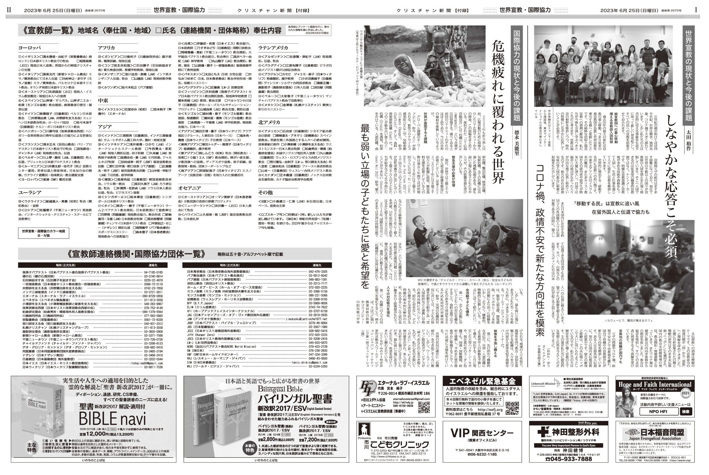 別刷 2023世界宣教・国際協力 祈りと支援のガイド 2023年6月16日 ニュース ≪世界宣教の現状と今後の課題≫ しなやかな応答こそ必須 大田裕作(アンテオケ宣教会総主事) ≪国際協力の現状と今後の課題≫ 危機疲れに覆われる世界 德永 美能里(特定非営利活動法人ワールド・ビジョン・ジャパン マーケティング第一部コミュニケーション課) フォトニュース