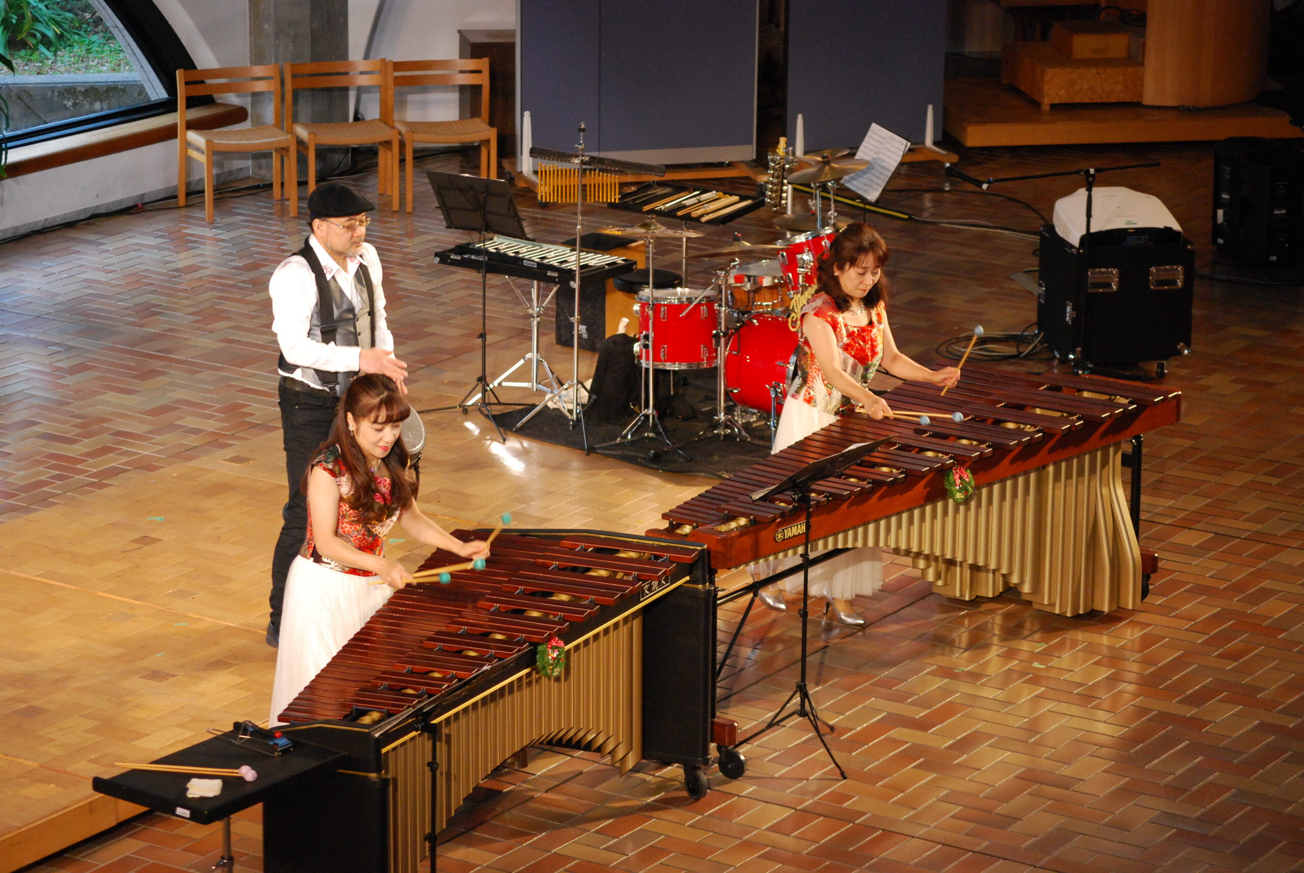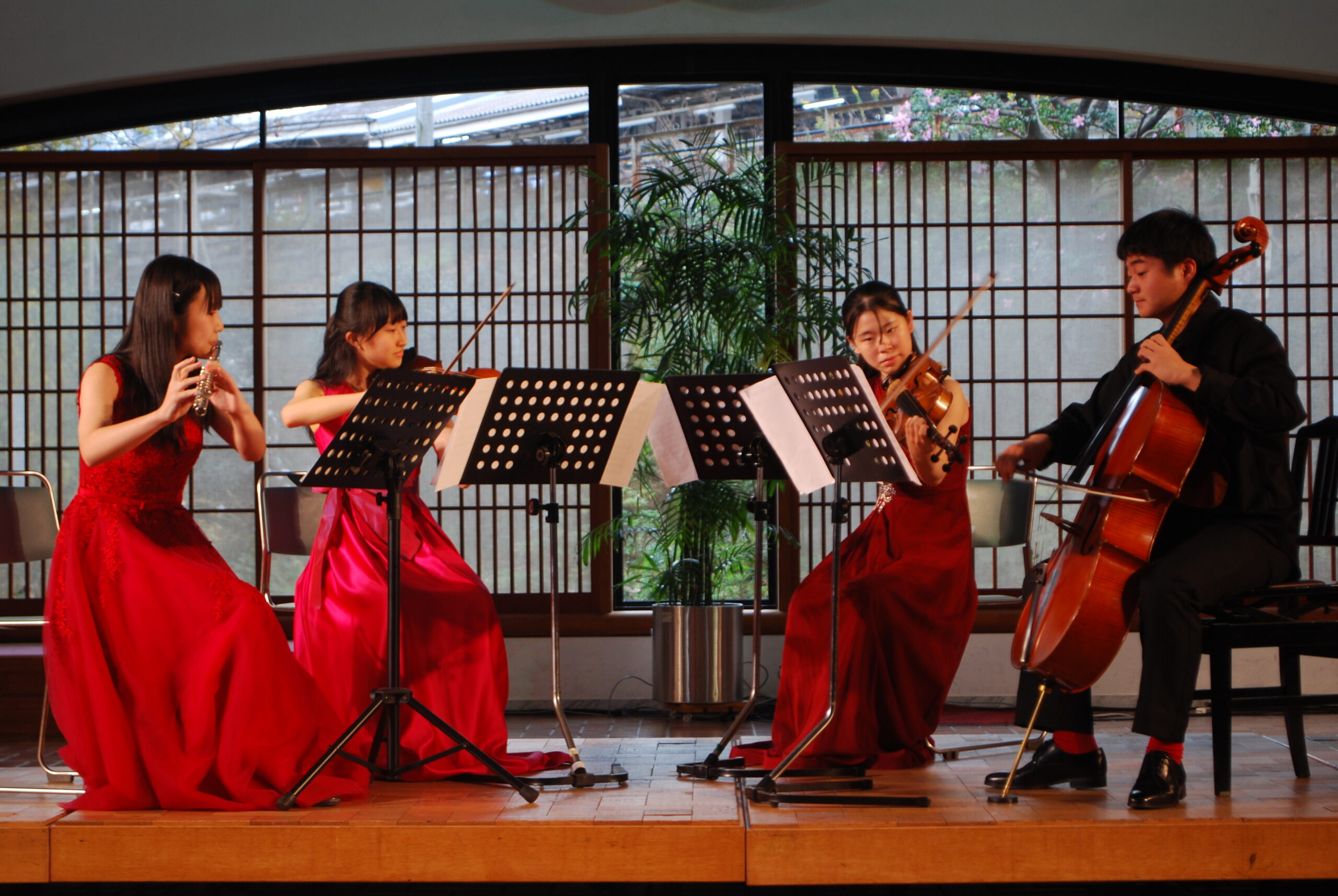 「音楽の部」では、2グループが演奏。東京藝術大学音楽部附属音楽高等学校有志による、バイオリン、ビオラ、チェロ、フルートの四重奏は、モーツァルト、チャイコフスキー、クリスマスメドレーを、完成度の高い演奏で聴かせた。塩浜智子・玲子のマリンバと赤羽一則のパーカッションによるユニットは、「そりすべり」やマリンバで人気の高い「カヴァレリア・ルスティカーナ」間奏曲などを演奏。アンコールの「情熱大陸」は圧巻だった。