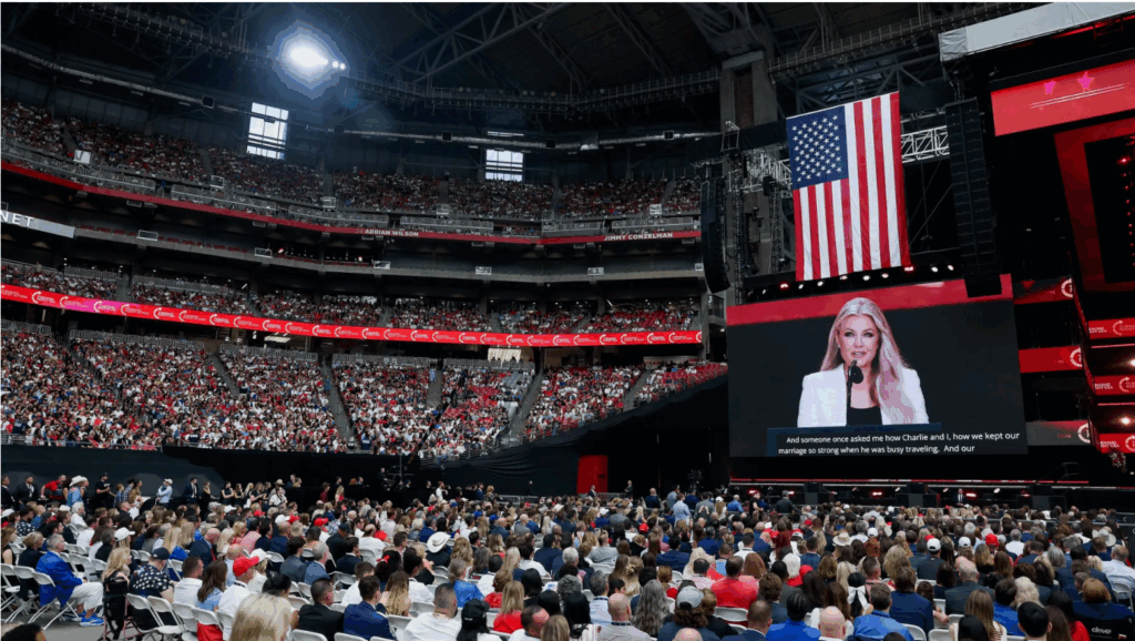 エリカ・カークは夫の殺人犯を許し、クリス・トムリンのようなクリスチャンスターが礼拝を主導し、MAGAの有力者や牧師たちはイエスと保守主義について語った。