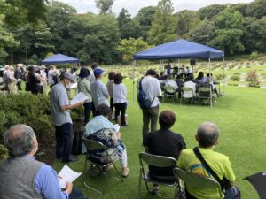 第二次世界大戦敗戦から77周年。今年も「第28回英連邦戦没捕虜追悼礼拝」(同実行委員会主催)が8月6日、神奈川県横浜市保土ヶ谷区の英連邦戦没者墓苑で開催。関田寛雄氏(日本基督教団教師)が、同追悼礼拝で追悼の辞を述べた。関田氏が追悼の辞を述べるのは今回が最後となる。また戦争の傷の癒やしや和解のため、英国をはじめとする元捕虜や抑留者、その家族を日本に招く活動を続ける恵子ホームズ氏(アガぺワールド代表)が挨拶した。