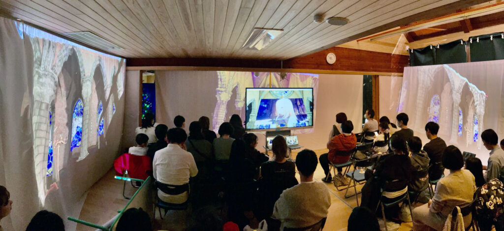 メタバースとは、インターネット上に構築された三次元の仮想空間のこと。当日は、その空間に設置されたVR(ヴァーチャルリアリティ)の教会を複数のプロジェクターで投影した。最初に野澤園長がメタバースから挨拶。「今日はメタバース空間内にあるホリベル教会と、リアルにある要町幼稚園がシンクロして一つのクリスマスミニコンサートを開催する企画。メタバースから参加の皆様もリアルから参加の皆様もぜひお楽しみいただきたいと思います」