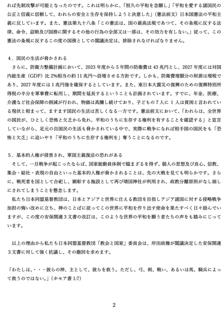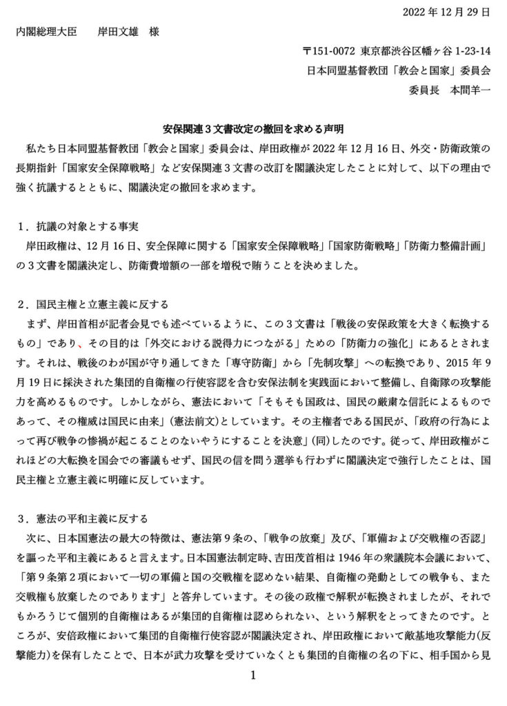 日本同盟基督教団「教会と国家」委員会(本間羊一委員長)は、岸田政権が2022年12月16日、外交・防衛政策の長期指針「国家安全保障戦略」など安保関連3文書の改訂を閣議決定したことに対し12月29日、本間委員長の名前で抗議声明を発表。岸田文雄内閣総理大臣宛に送付した。