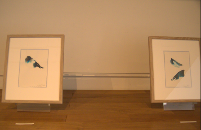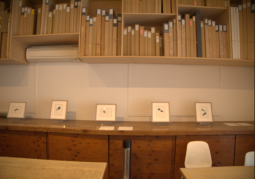 ヒスイ色の鳥たちの小さな絵画も並ぶ。フジムラ氏が暮らす米国プリンストンでは、「雪の予感がすると必ず訪れる」鳥だそうだ。また4月のこの時期は、「大雪の下積みになって根っこを伸ばしたチューリップ」がたくさん咲くのだという。