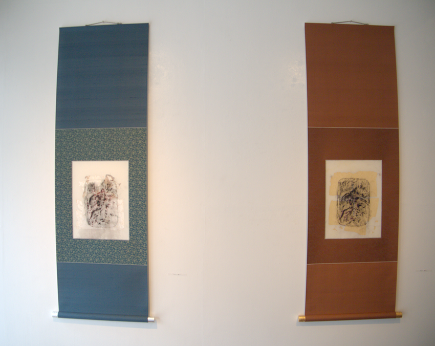 ギャラリーの入り口近くの藍色と朱色の掛け軸は、「踏み絵」。薄い紙の表面には、踏み絵の輪郭がおぼろげに見え、紙の裏から貼った金箔、銀箔が背景に見える。踏み絵はフジムラ氏がスペシャルアドバイザーを務めたマーテン・スコセッシ監督の映画「沈黙ーサイレンス」にも使われた小道具を擦ったものとのことだ。