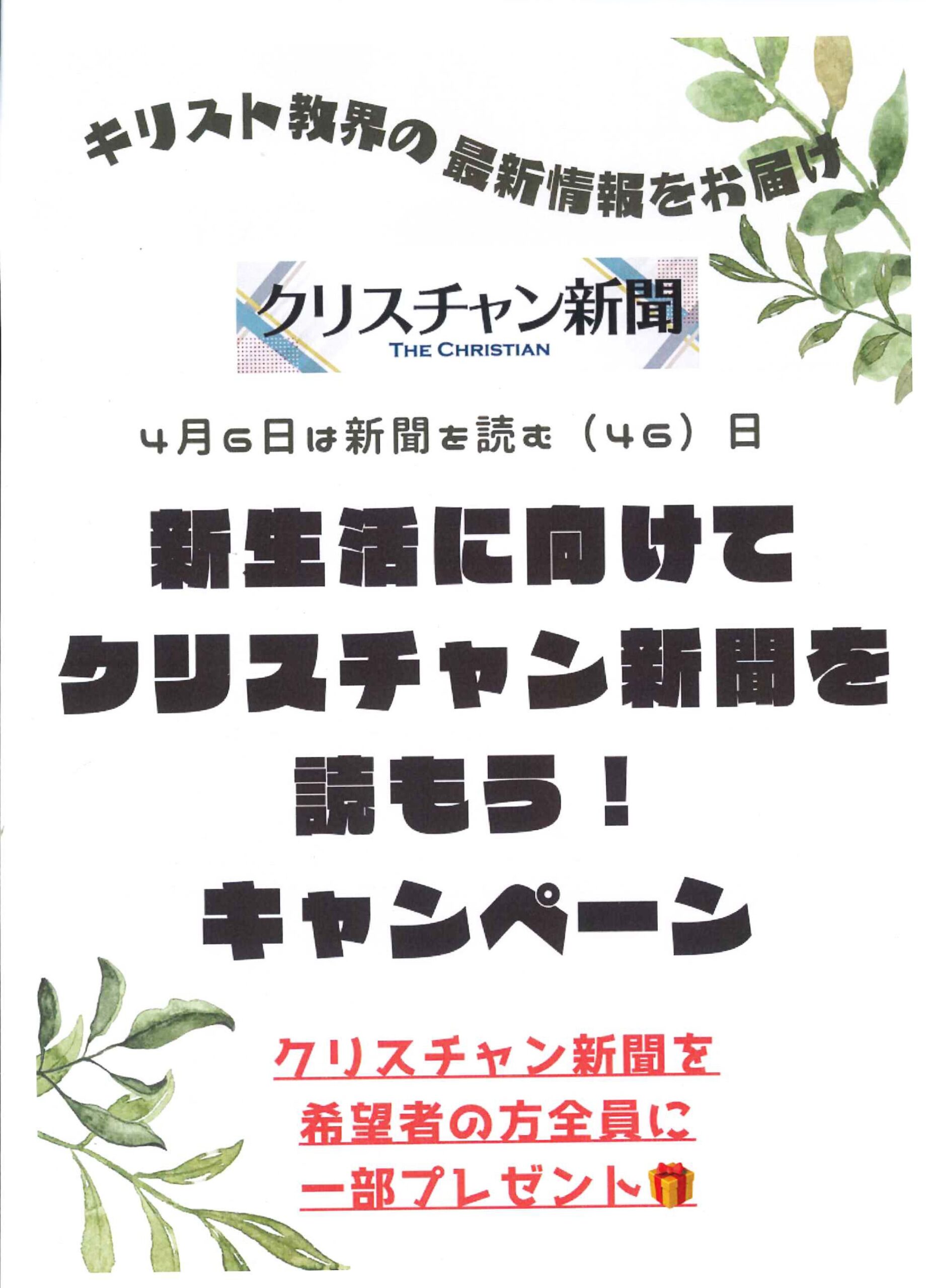 【30日まで】新聞をヨム 新生活に一部プレゼントキャンペーン 2024年4月29日 ニュース 4月6日、新聞をヨム(46)日にちなんで、クリスチャン新聞では、 「新生活に向けてクリスチャン新聞を読もう! キャンペーン」 を実施します。 ◆キャンペーン期間◆ 2024年4月6日(土)~4月30日(火)まで お申込いただいた段階での最新号をお届けいたします。 以下のフォームをお申込みいただけ方にお送りいたします 週刊クリスチャン新聞1部無料プレゼント申込フォーム (google.com)