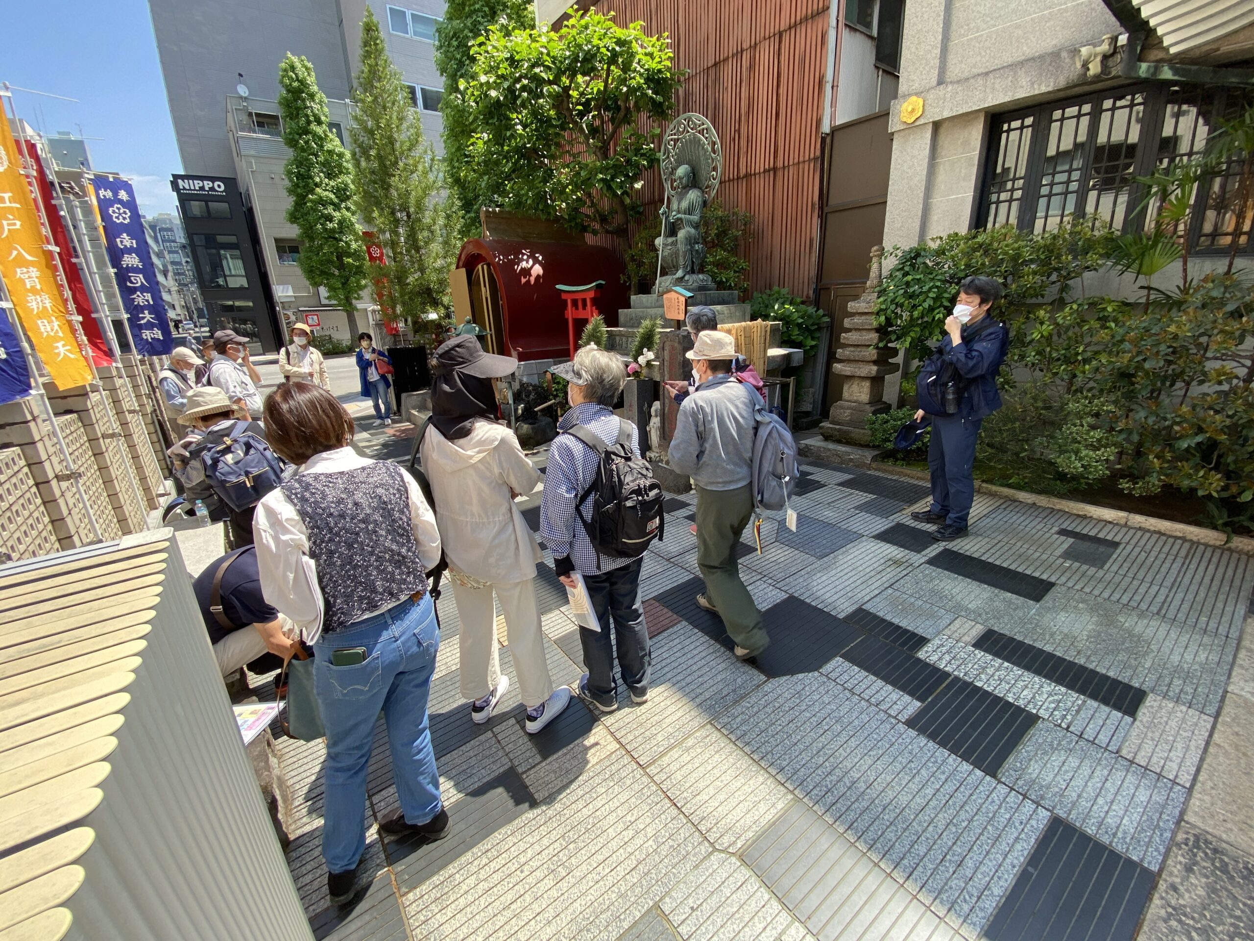 甚内橋の跡地の石碑を囲む参加者たち。切支丹の血で染まったであろう鳥越川は現在、道路下の暗渠(あんきょ)となっている。整った区画の中でこの道だけ蛇行していることが、残された数少ない面影の一つ。