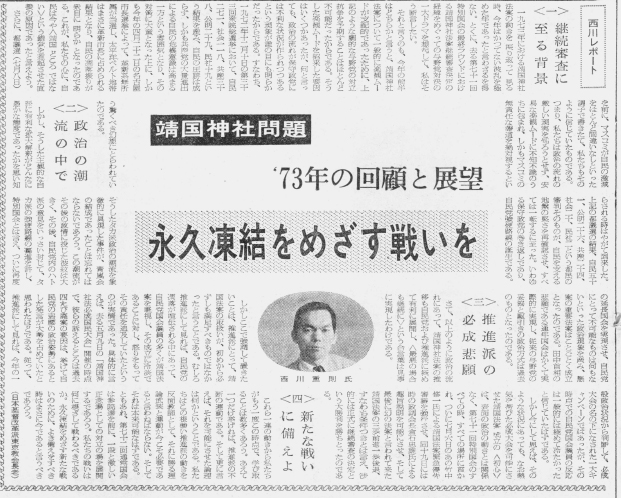 自身戦病死した兄を靖国神社に祀られた遺族でもある西川重則さん(平和遺族会代表、「政教分離の会」事務局長)は、当時日本キリスト改革派教会での靖国問題の取り組みの先頭に立ち、各地で講演活動をしていた。本紙には「西川レポート」として、靖国問題の動向を随時知らせていた。