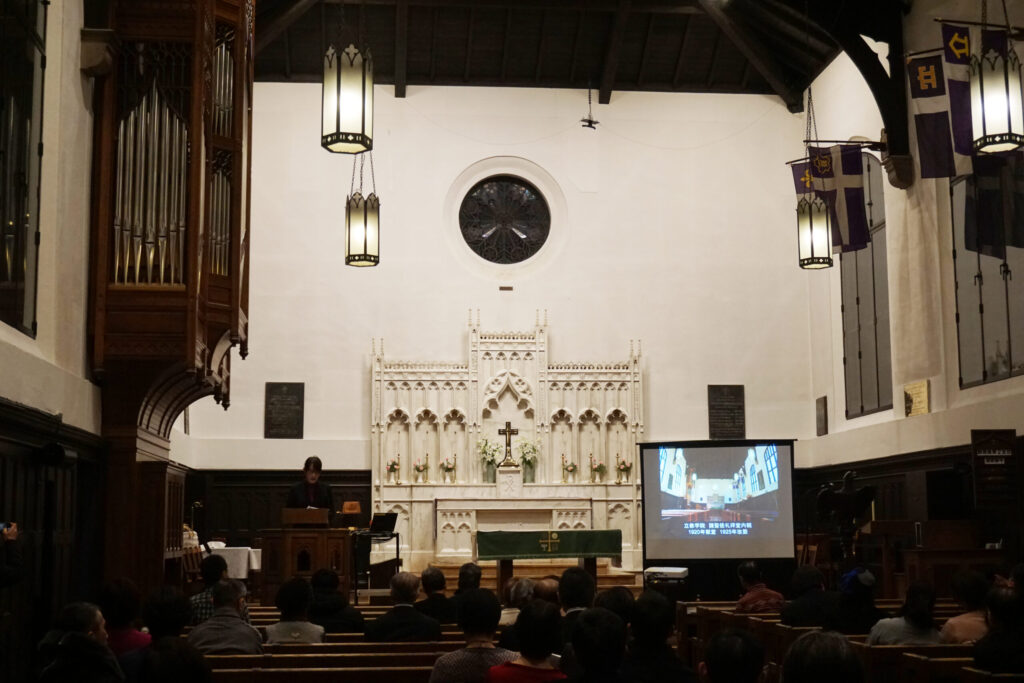 この礼拝堂は、建設当初の雰囲気を保ちつつも、歴史の荒波の中でその姿を変貌させてきた。建築意匠の観点から、同大学文学部キリスト教学科教授で美術史が専門の加藤磨珠枝氏が1月21日に記念講演をした。
