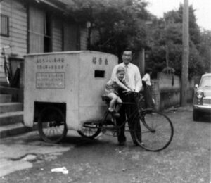 自転車に取り付けたリヤカーの上に、小さな小屋のようなものを載せた上の写真は、いのちのことば社の初期に活躍した移動販売車だ。「福音車」と名付けて信仰書や伝道用のパンフレット(トラクト)を載せ、駅前の繁華街などでトラクトを配り、本を売った。読むものに飢えていた人々は、外国人が引いてきた珍しい車に目を引かれて集まってきたという。