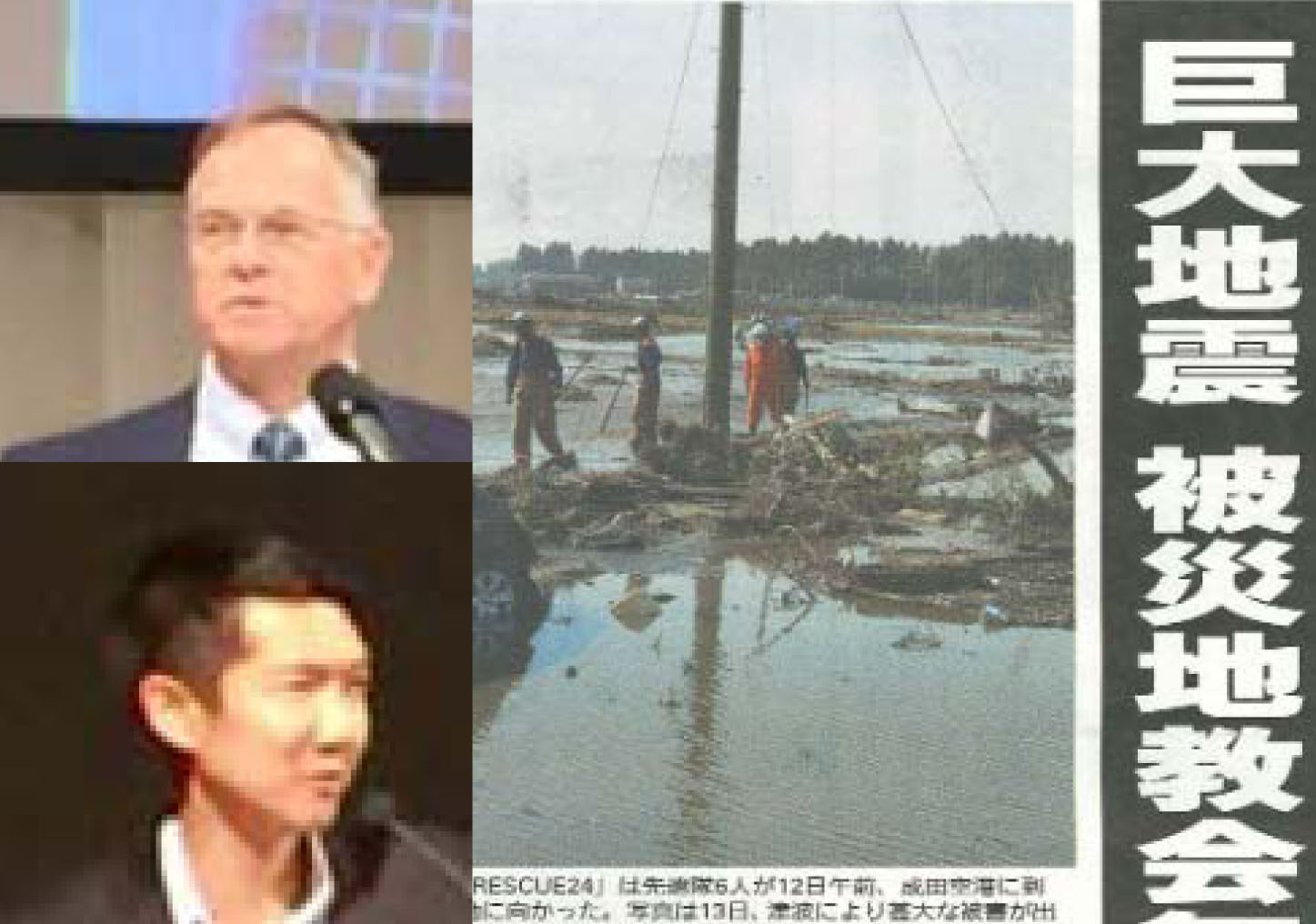 左は第六回日本伝道会議(2016年)でクリス氏、オー氏、右は2011年3月27日号1面から