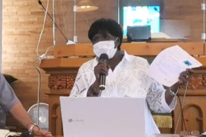 西那須野教会で。入管の許可書を持って話すエリザベスさん(右)