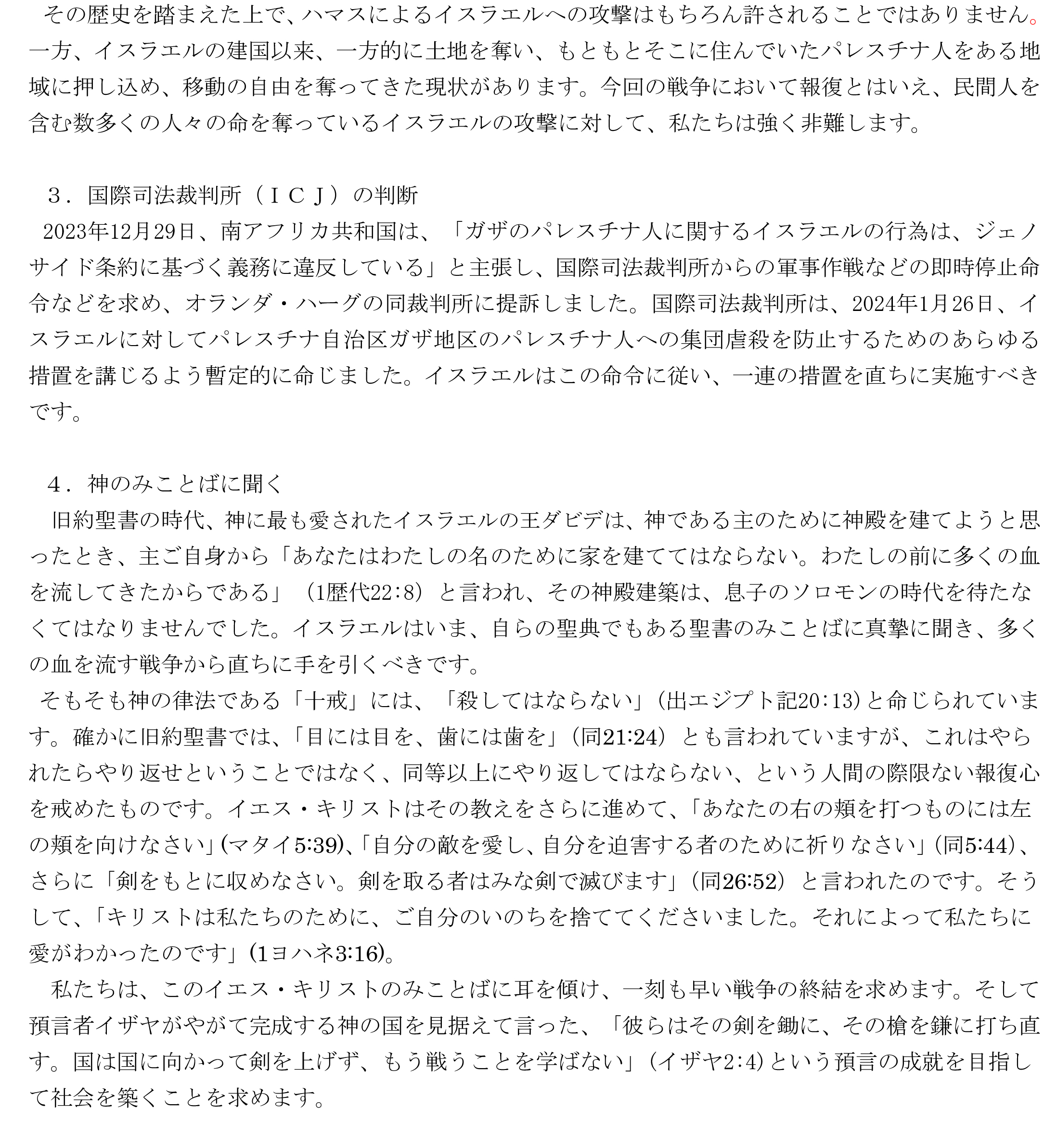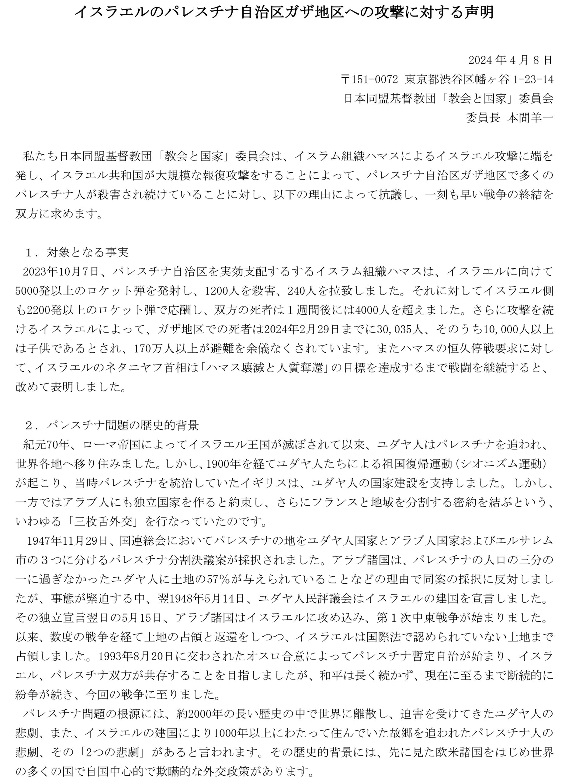 日本同盟基督教団「教会と国家」委員会(本間羊一委員長)は4月8日、「イスラエルのパレスチナ自治区ガザ地区への攻撃に対する声明」を発表。イスラム組織ハマスによるイスラエル攻撃に端を発した、イスラエル共和国による大規模な報復攻撃で、ガザ地区で多くのパレスチナ人が殺害され続けていることに対し抗議し、一刻も早い戦争の終結を双方に求めた。 (詳細は以下の通り)
