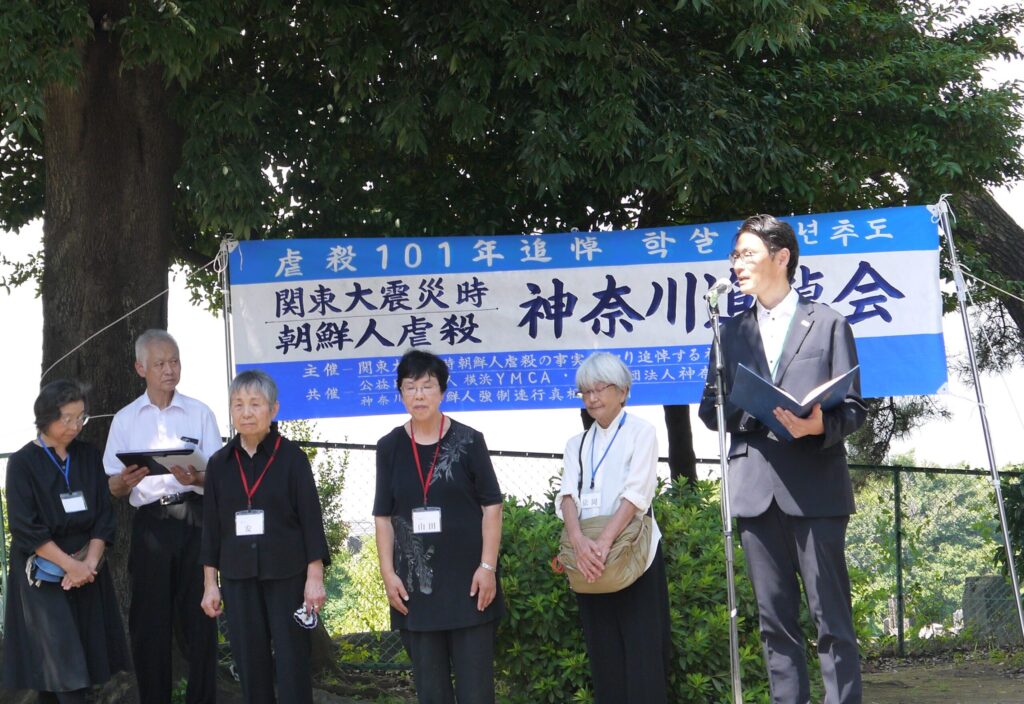 閉会のあいさつには、横浜YMCAの佐竹博総主事が立ち、「101年前のことを繰り返してはならない。現在は情報があふれる、あっという間にデマが広がってしまう。冷静に考え、多数意見だけが正しいのではなく、違いを認め合い、共に生きることが大事。何よりもいのちが大切ということを、いま、これからの挑戦、実践の中で考えたい。これからも追悼の祈りの輪が続き、広がることを願う」と述べた。