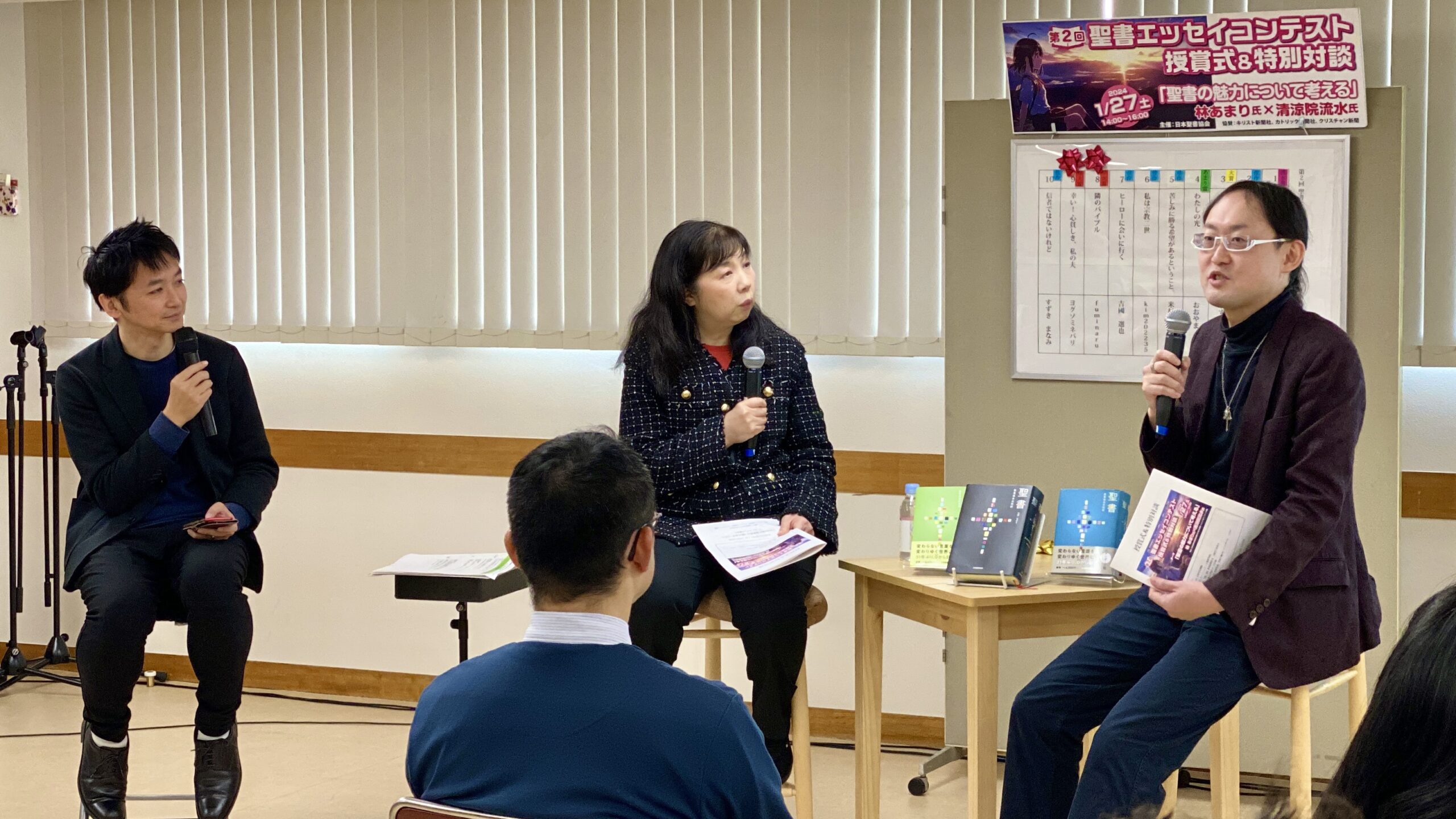 歌人で演劇評論家の林あまりさん、作家で英訳者の清涼院流水さんの二人の審査員と、キリスト新聞編集長の松谷信司さんが、独特なトークを展開。