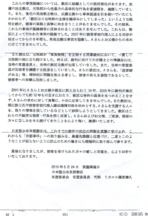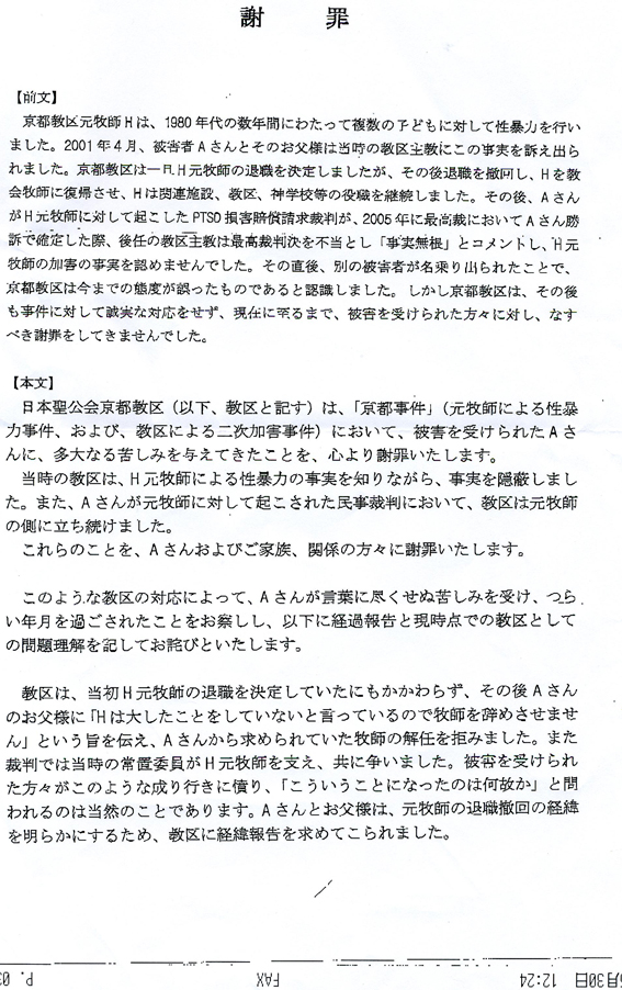 日本聖公会京都教区常置委員会(ミカエル藤原健久委員長)は、「京都事件」(同教区H元牧師による性暴力、および同教区による二次被害)について、謝罪文を5月24日に発表した。