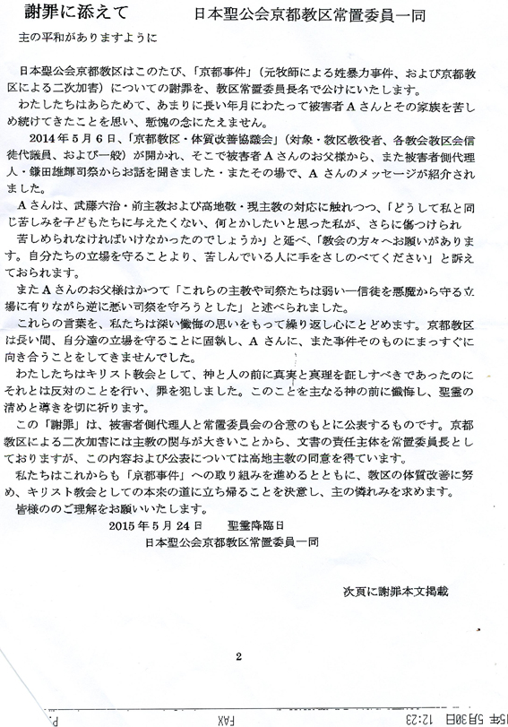 同時に発表された「謝罪に添えて」では、14年5月に「京都教区・体質改善協議会」が開かれたことを報告する、今回の謝罪が被害者側代理人と常置委員会の合意のもとでの公表であり、高地主教の同意も得ていることを明記した。