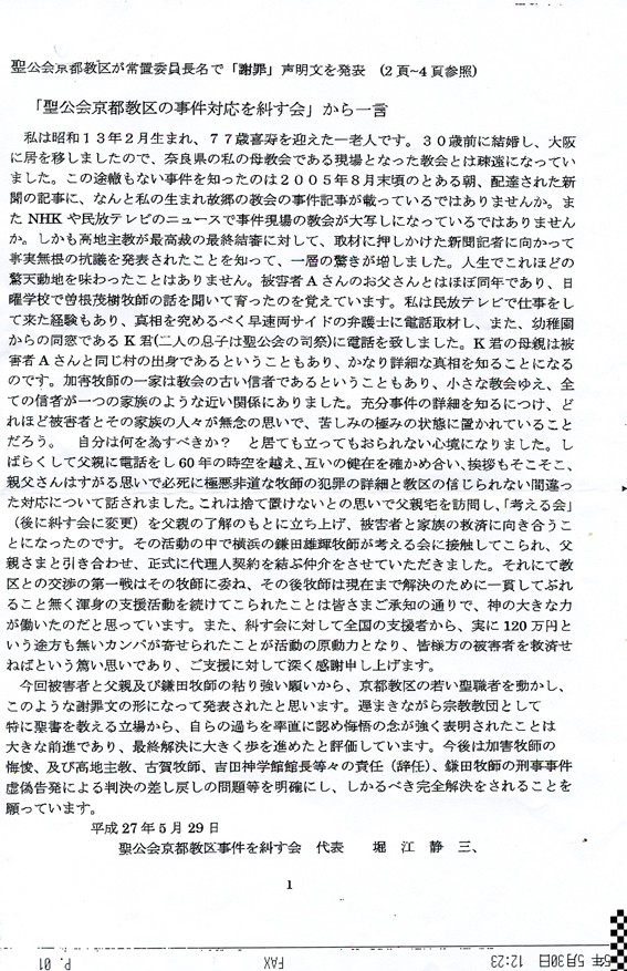 同教区の責任追求を続けた「聖公会京都教区事件を糾す会」(堀江静三代表)も謝罪に合わせて「『聖公会京都教区事件を糾す会』から一言」を発表。被害者と父親、被害者代理人の鎌田雄輝司祭の「粘り強い願いから、京都教区の若い聖職者を動かし、このような謝罪文の形になって発表された」と背景を説明する。