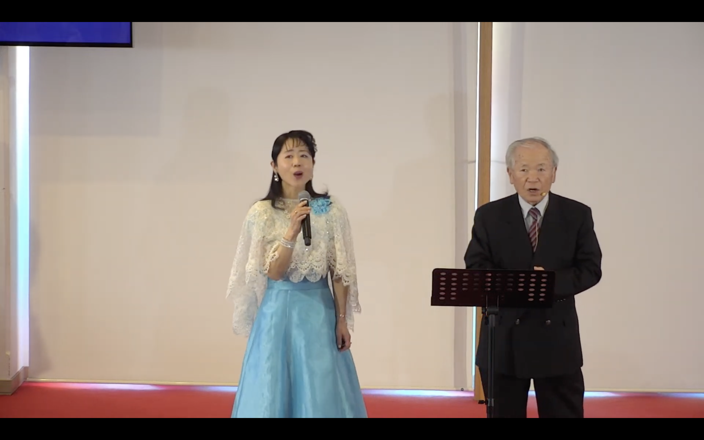 「しあわせ運べるように」を会衆とともに歌う、森さんと菅原氏