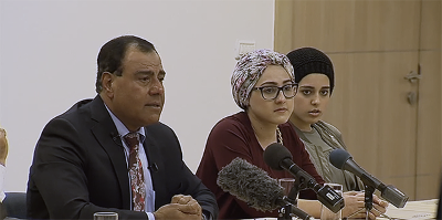 イスラエル軍に自宅を砲撃され重傷を負った四女マイヤール(中央)も裁判で砲撃の非を訴える父をサポートする (C)Filmoption