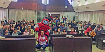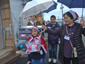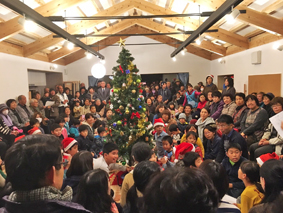 夜の仮設集会場におけるキャロリングでは、多くの住民の方々が集まり、茨木ロータリークラブ寄贈のクリスマスツリーを囲んで一緒にクリスマスキャロルを歌ったり、ゲームをすることで、みんなで一体となる姿がありました。特に、子どもたちの楽しそうな歌声と笑顔がありました。自治会長の中には、クリスマスキャロルに感動され、キリスト教についてもっと知ってみたくなったとの嬉しい反応もありました。