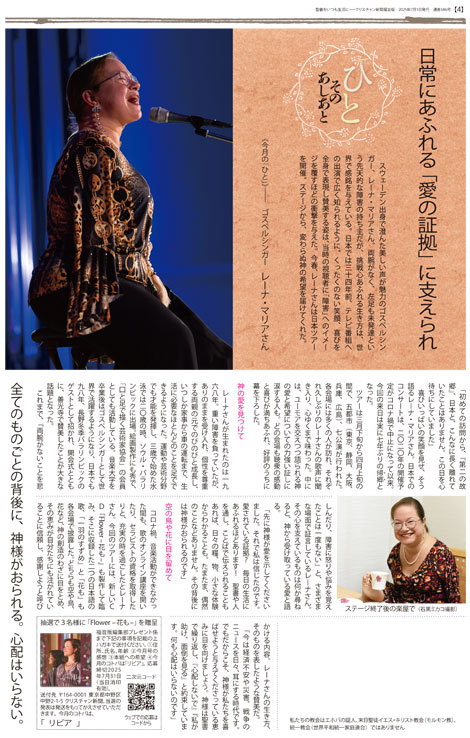 スウェーデン出身で澄んた美しい声が魅力のゴスペルシンガー、レーナ・マリアさん。両腕がなく、左足も未発達という先天的な障害の持ち主だが、挑戦心あふれる生き方は、世界で感銘を与えている。日本では三十四年前、テレビ番組への出演で広く知られるように。くったくのない笑顔、喜びを全身で表現し賛美する姿は、当時の視聴者に「障害」へのイメージを覆すほどの衝撃を与えた。今春、レーナさんは日本ツアーを開催。ステージから、変わらぬ神の希望を届けてくれた。